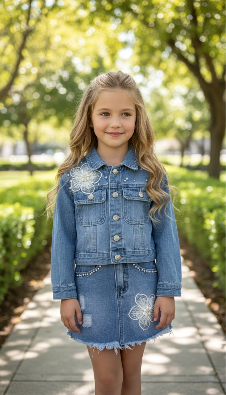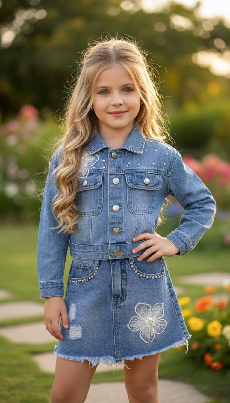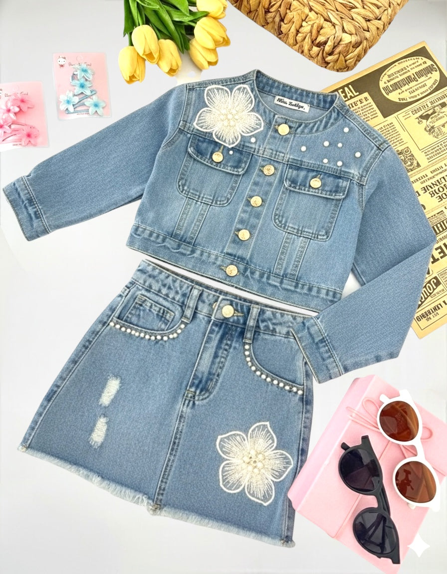 Saia jeans combinada com borçado floral na parte inferior, detalhes de pérolas nos bolso, com cinteira ajustável com elástico redutor.