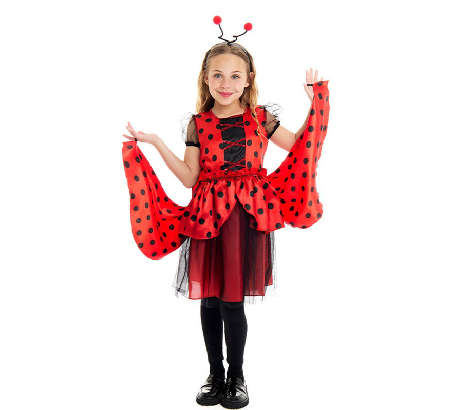 Fato de joaninha para menina. Inclui vestido, fita para a cabeça e asas.