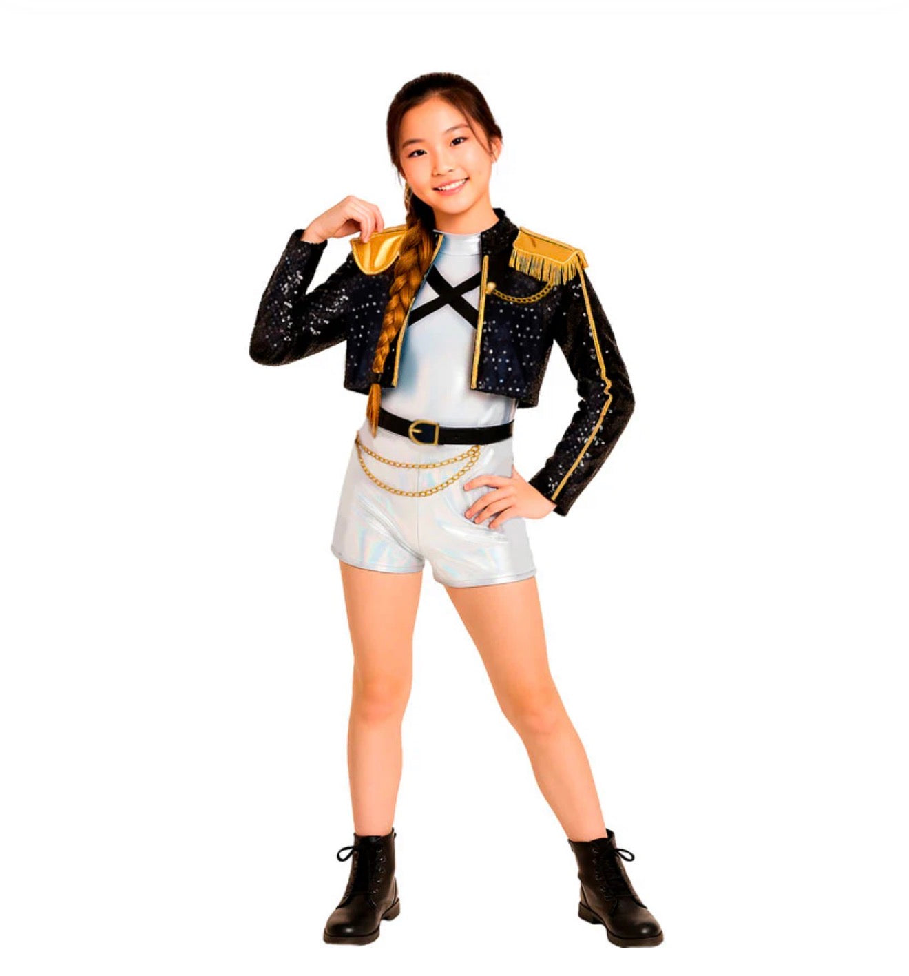 Este disfarce inclui: casaco com lantejoulas e pormenor com corrente, camisola e calções com cinto e corrente.